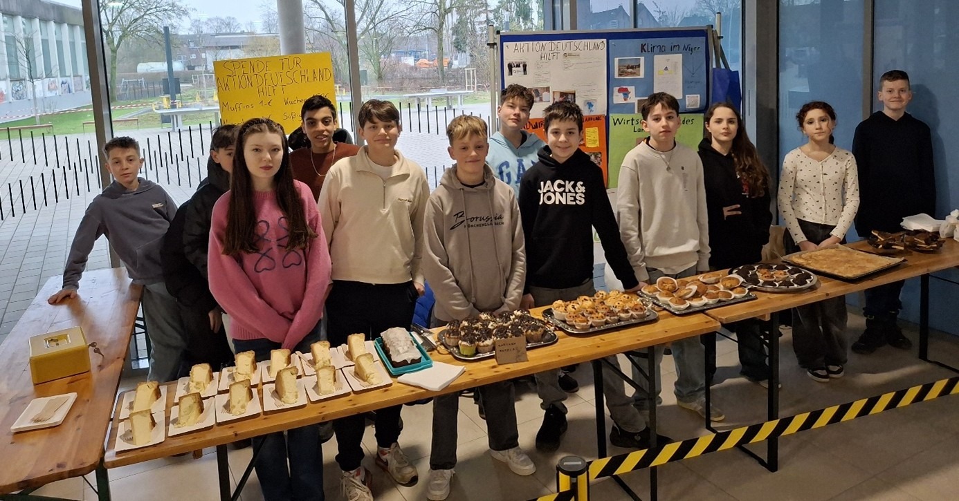 Kuchen, Muffins, Süßigkeiten und Nussecken hatte der WP-Kurs SW im Angebot, um Spenden für die „Aktion Deutschland hilft“ zu sammeln. Die Siebtklässlerinnen und Siebtklässler konnten sich darüber freuen, dass sie innerhalb kürzester Zeit ausverkauft waren. So kamen 160 Euro für den Bildungsprojekte im westafrikanischen Niger zusammen.