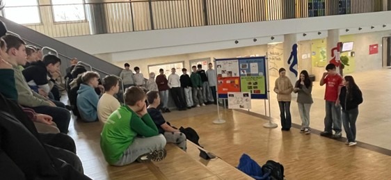 Um ihre Mitschülerinnen und Mitschüler über die Hintergründe zu informierten und um noch mehr Aufmerksamkeit für ihre Spendenaktion zu bekommen, hatte der WP-Kurs die Klassen 5 und 6 bereits vorab zum Vortrag ins Forum eingeladen. Hier präsentierten sie vor knapp 200 Kindern ihre Plakate zur „Aktion Deutschland hilft“, zu Landwirtschaft und Ernährung, zum Klima in Niger, zur Wirtschaftskraft des Landes und zum Bildungswesen. Und sie konnten sich über einen tollen Erfolg freuen und nun 160 Euro für Bildungsprojekte in Niger an die „Aktion Deutschland hilft“ spenden.